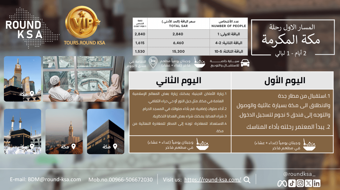 Umrah Plus: Makkah 2 Days / 1 Night, package 2-4 persons, Hotel Booking 5 stars in Makkah included breakfast, VIP Modern Car (Transportation from Jeddah to Makkah & Returned), Lunch meals, Dinner meals, Snacks, Juice & Bottled water. For more details: Email: BDM@round-ksa.com , WhatsApp 00966-504485626